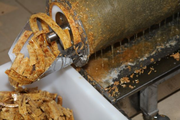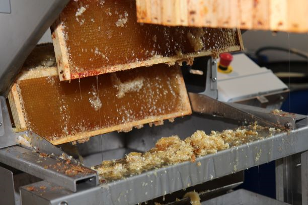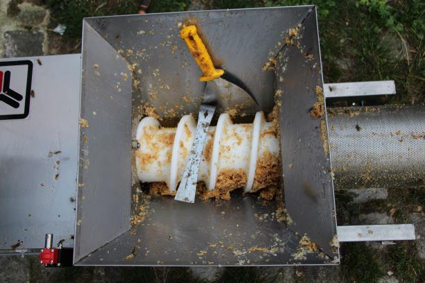 Les opercules chargées de miel sont collectées par une trémie et guidées dans une vis sans fin en nylon alimentaire, ce qui permet de séparer correctement le miel et la cire sans chauffer le miel.