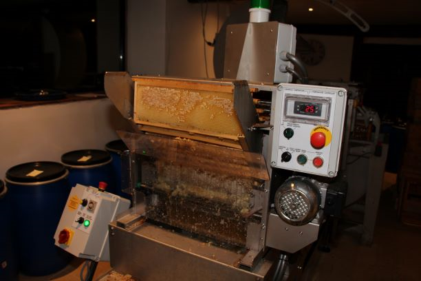 La miellerie est le local dans lequel le miel est extrait. L’extraction consiste à récupérer le miel présent dans les alvéoles. la première étape est la désoperculation. Lorque le miel est « mûr » les abeilles ferment l’alvéole avec un petit couvercle de cire qu’elles fabriquent. Cette opercule permet au miel de se conserver correctement car le miel est hydrophile: il capte l’humidité ambiante ( ruche ou local d’extraction). Au dessus de 18% d’humidité il y a un risque de fermentation, des petites bulles apparaissent en surface et le miel à un goût légèrement piquant à cause du gaz carbonique qui se dégage. La désoperculation est réalisée avec un couteau ou une machine à désoperculer. Nous utilisons actuellement une machine à désoperculer à lames oscillantes.